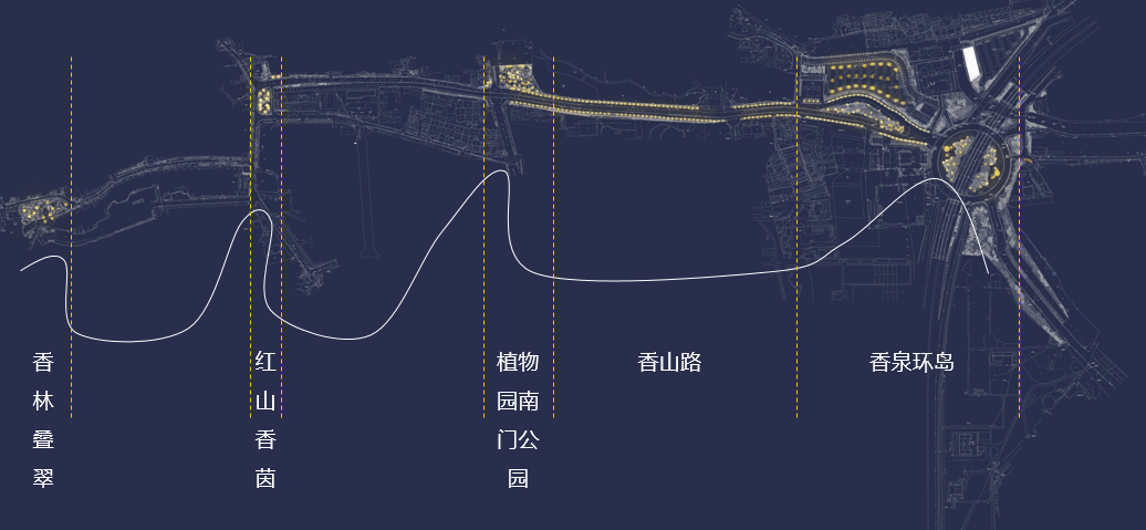 規劃設計中,信達設計師以香山環島、植物園南門入口公園、紅山香茵、香林疊翠為主要節點,并與行道樹形成明暗相間、峰谷韻生的亮度節奏,呼應香山山水環繞的自然格局。