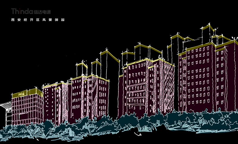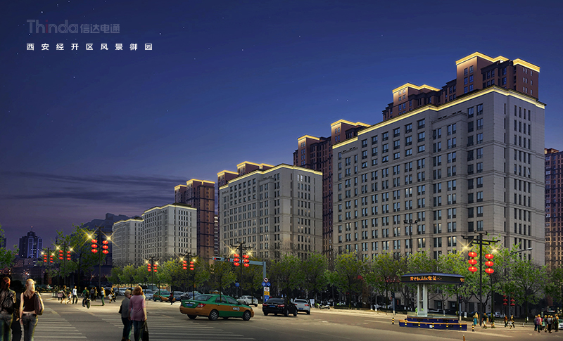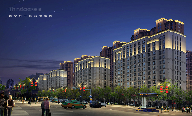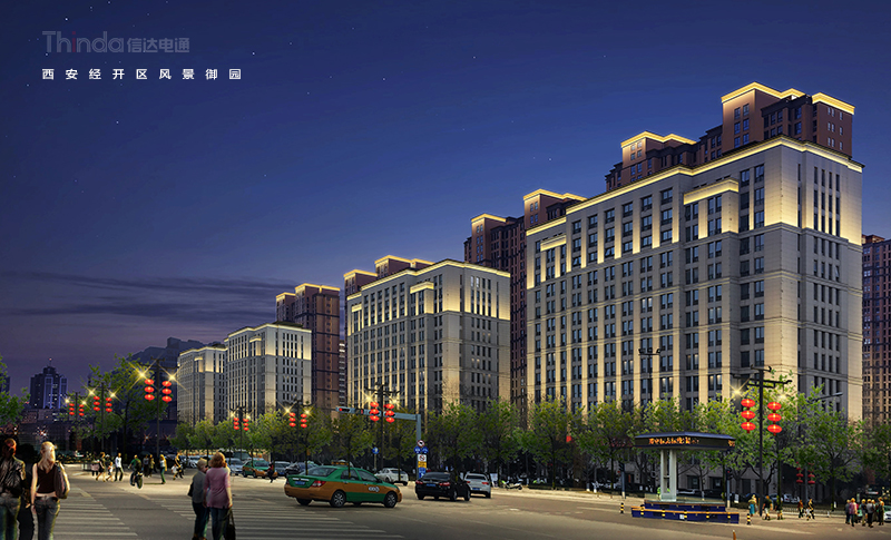 風景御園位于西安市經(jīng)開區(qū)鳳城八路,在市政府對面,本項為商業(yè)辦公樓夜景照明設計,建筑的立面材質(zhì)為淺色石材為主。四棟建筑的建筑形態(tài)相同,沿縱向結構游走,整體造型簡潔、大氣,本項屬于高層建筑。