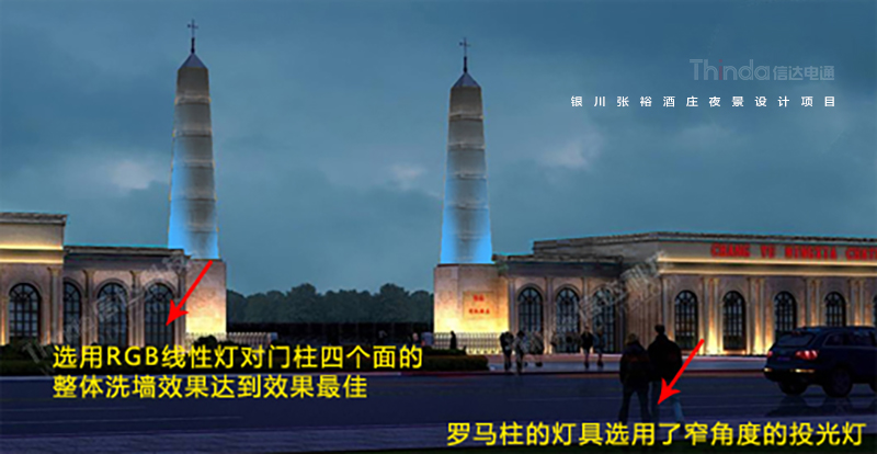 選用RGB線性燈對門柱的四個面的整體洗墻效果達(dá)到更佳,羅馬柱的燈具選用了窄角度的投光燈。
