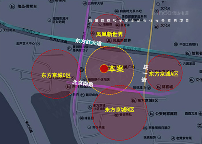 西亞和美商業廣場地處于河南省信陽市,位于東方紅大道、南臨北京南路、東臨統一街,周邊有鳳凰新世界、東方京城、軸線之廊,位置優越,交通便利。這里信陽人民平時生活娛樂與購物餐飲的地方,也是IGA中國區優秀零售商。目前商業廣場夜景照明已經跟不上整體的商業需求,急需進行照明設計施工改造升級,為此信陽西亞和美業主聯系到信達電通,雙方根據本案開展照明設計施工合作。